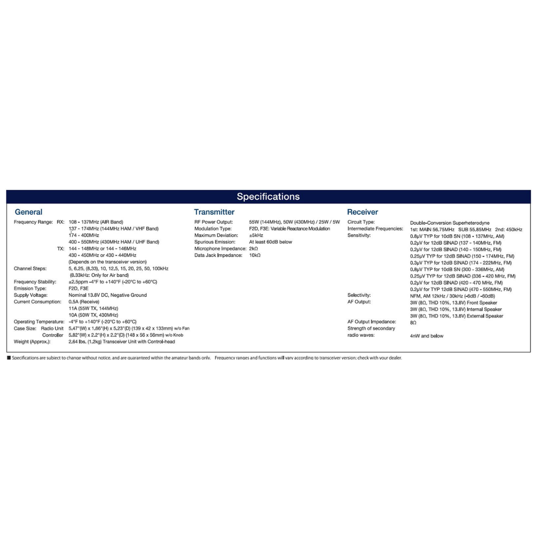 RF Power Output: 55W (144 MHz) / 50W (430 MHz)